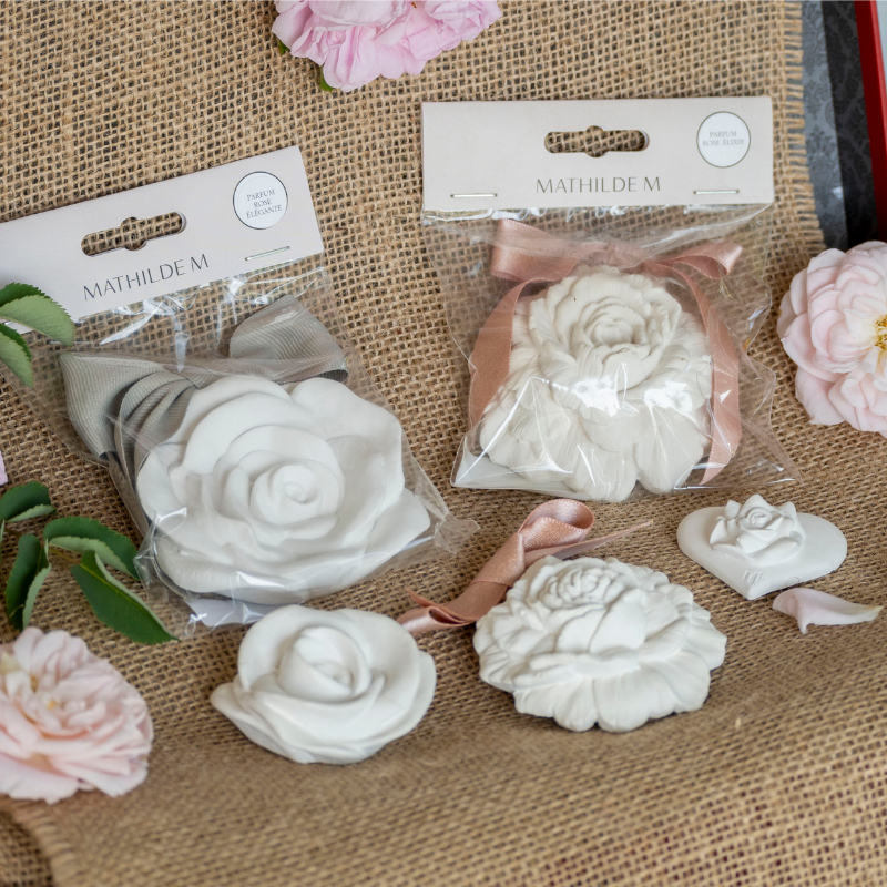 Véritable signature de la maison Mathilde M, ce décor en plâtre parfumé incarne tout le savoir-faire artisanal de la marque. Chaque pièce est minutieusement ciselée à la main dans les ateliers, puis entièrement imprégnée de parfum pour diffuser, lentement et durablement, sa douce senteur florale.