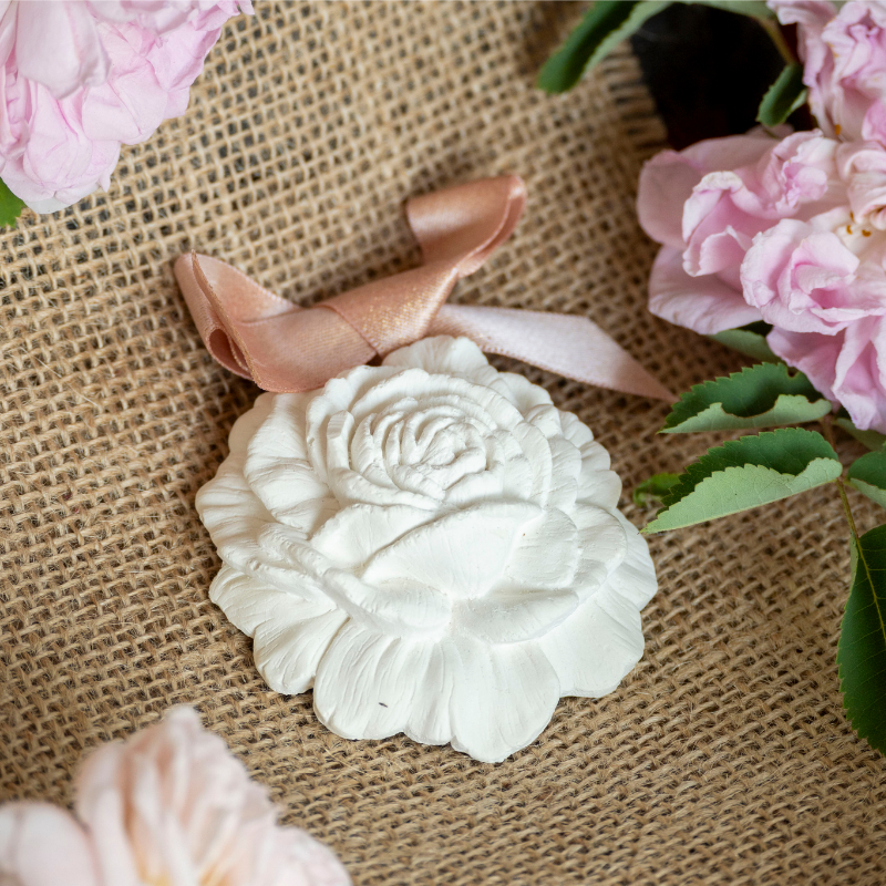 Un décor en plâtre sculpté à la main et parfumé à la senteur Rose Élixir. Élégant et raffiné, il parfume subtilement petits espaces, armoires et tiroirs.