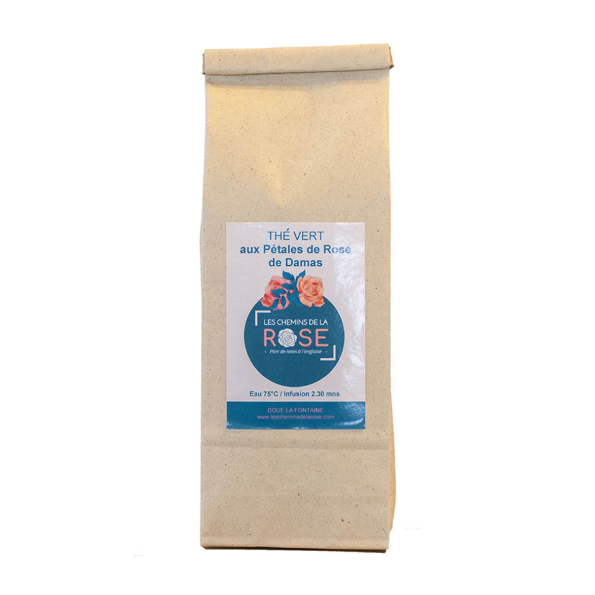 Thé vert artisanal à la rose, agrémenté de pétales bio (Damas ou Gallica Officinalis). Une infusion florale raffinée. Sachet de 100 g.